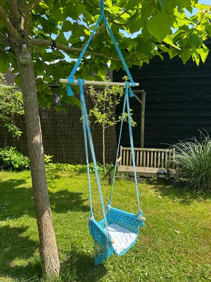 Let your little one float in comfort with the Sky Slice — a lovingly handcrafted macramé swing in a cheerful sky-blue shade. This unique piece brings a gentle boho charm to any space, whether it’s indoors or hanging from a shady tree in the garden.