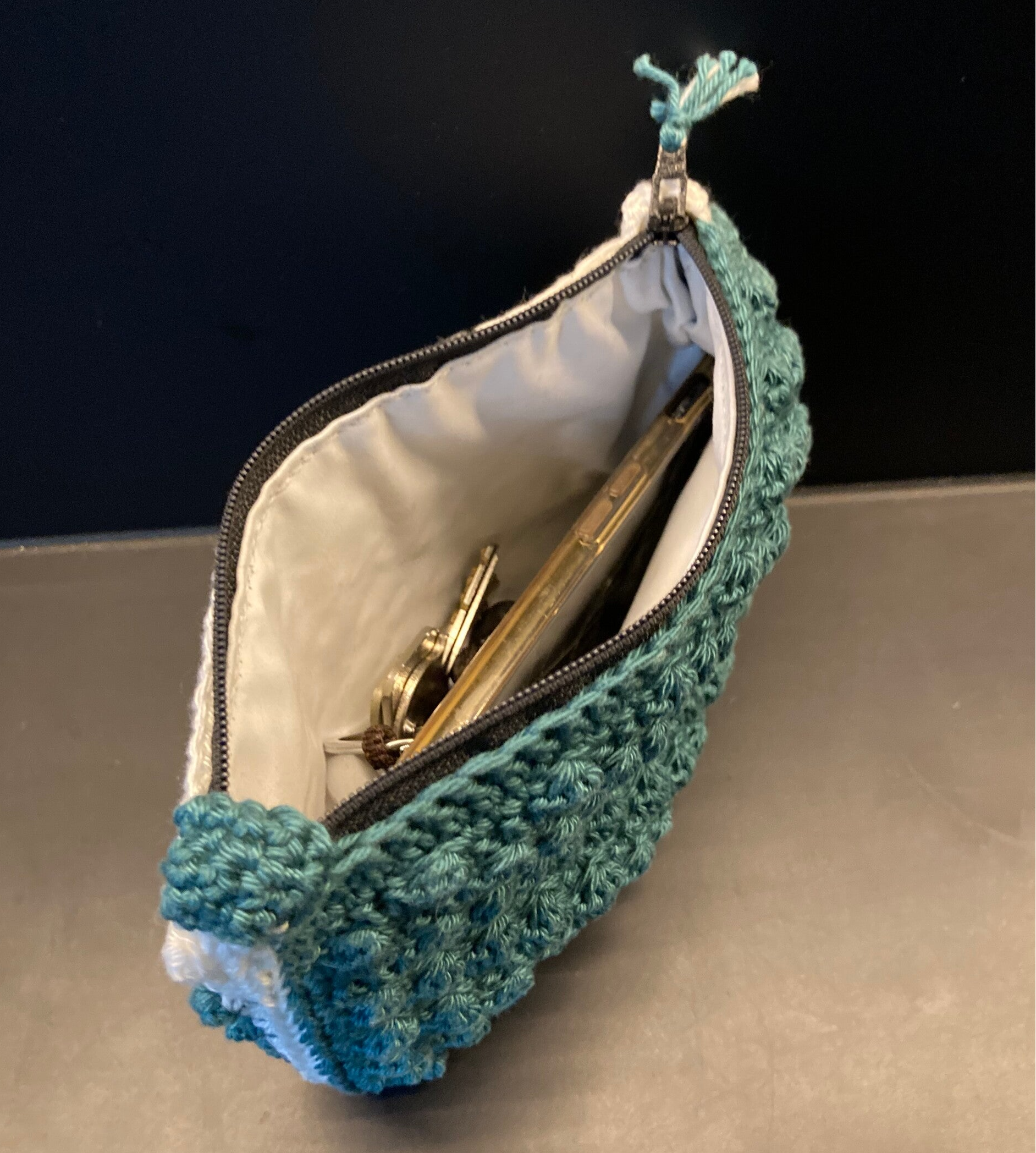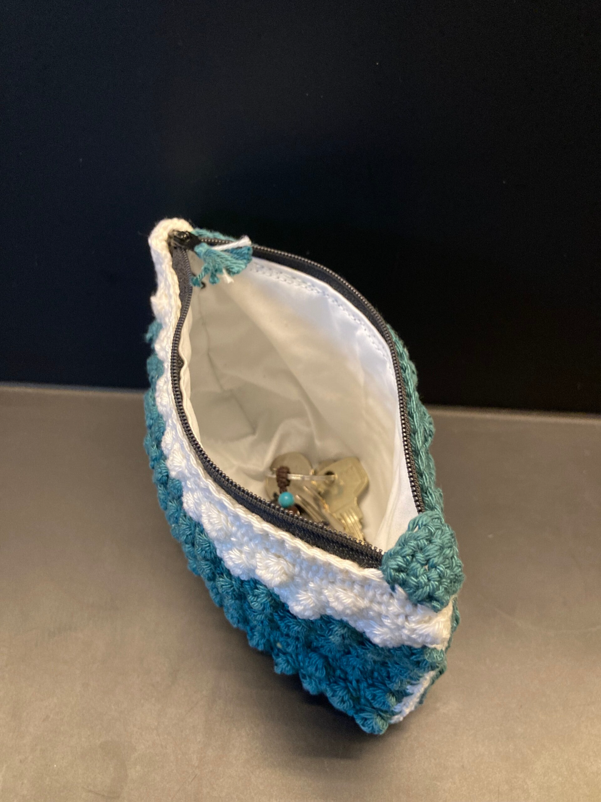 This handmade crochet bubble clutch in forest green acrylic yarn is both stylish and functional. Featuring a textured bubble design, secure zipper closure, and soft inner lining, it’s the perfect accessory for adding a unique, cozy touch to any outfit.