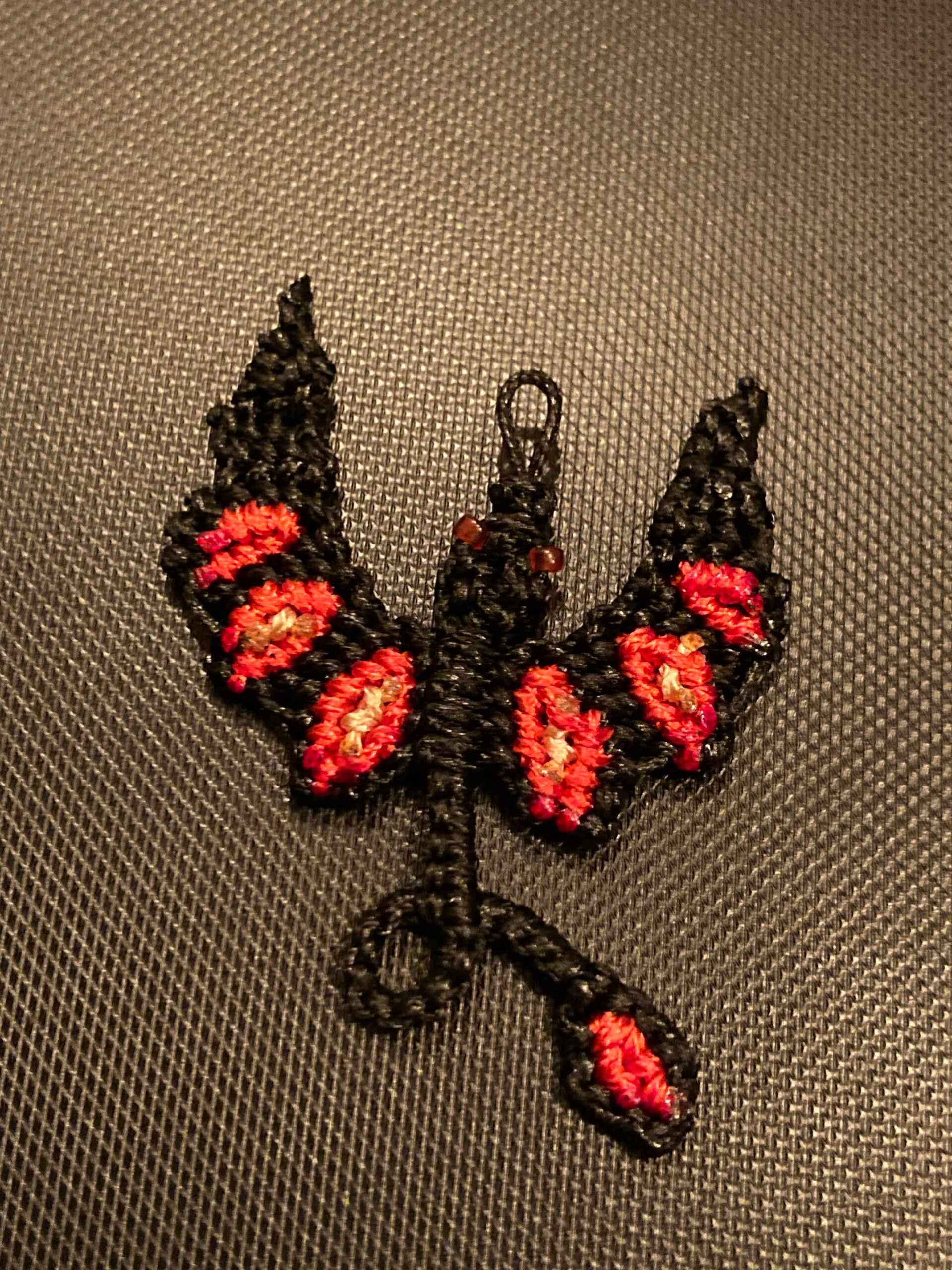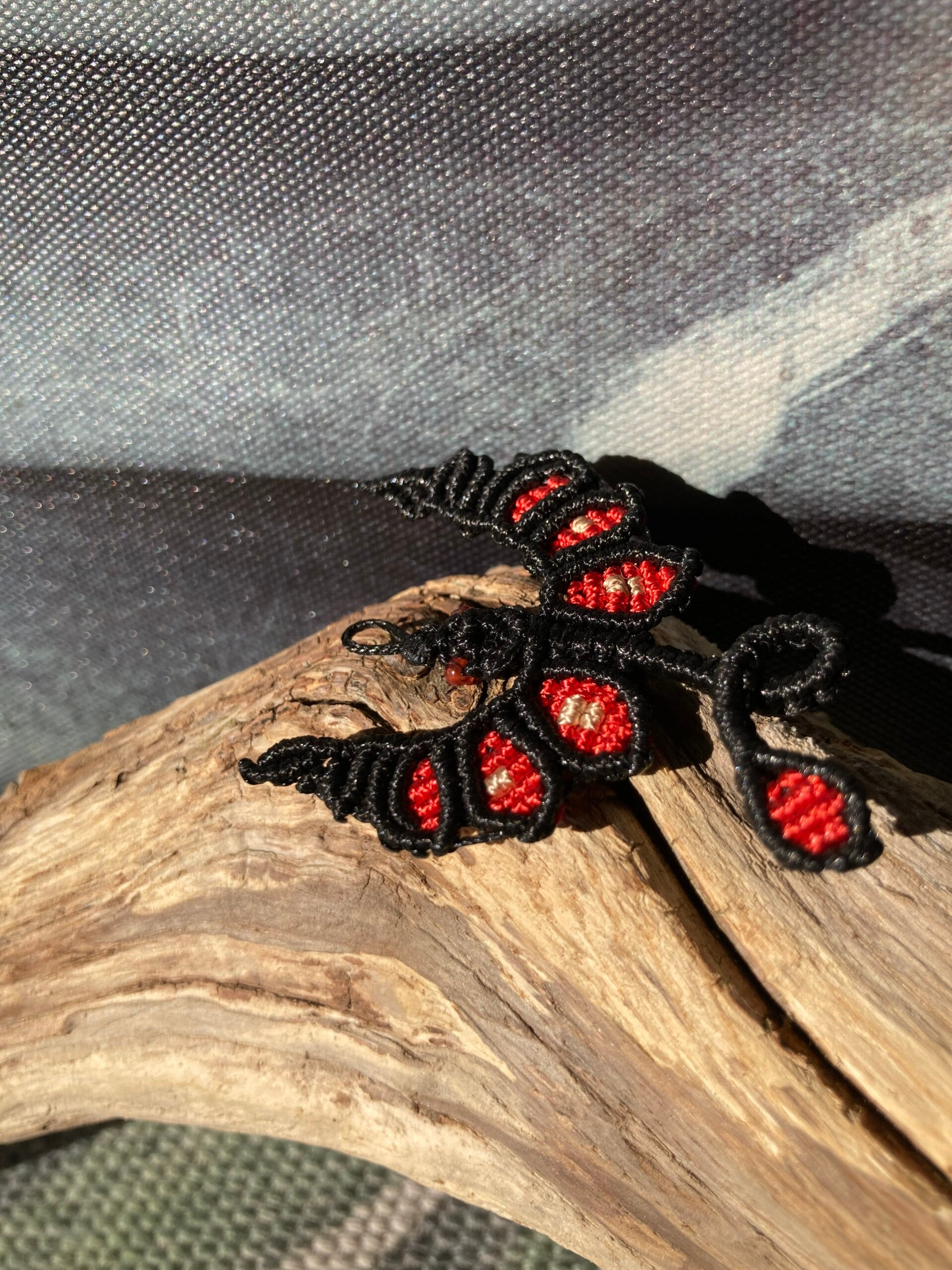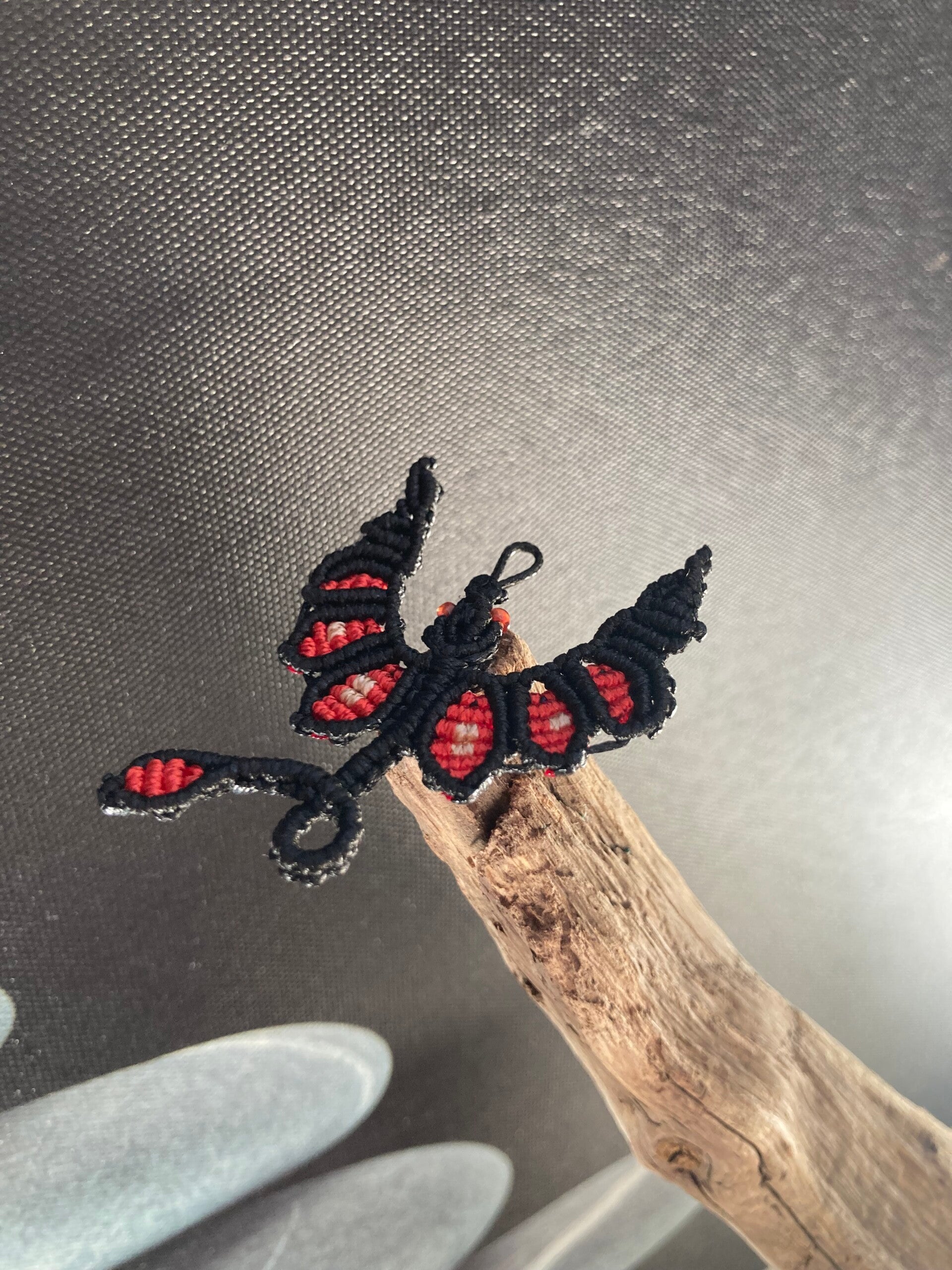 This stunning micromacrame dragon pendant is meticulously handcrafted with black and red cords, creating a bold, mythical design. The intricate knotting captures the dragon's fierce, elegant form, with detailed wings and a striking silhouette that symbolizes strength and mystery. Perfect as a statement piece, this pendant is ideal for anyone who loves unique, artisan jewelry with a touch of fantasy.
