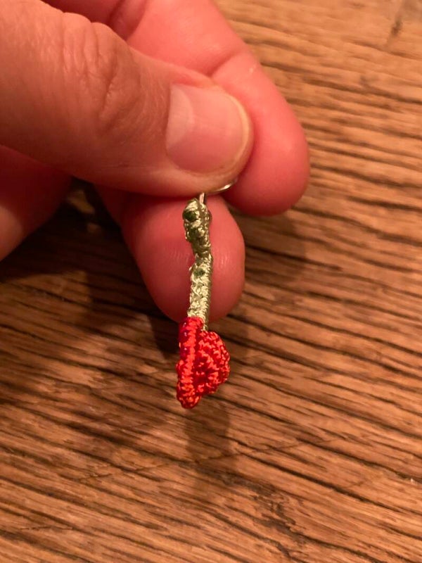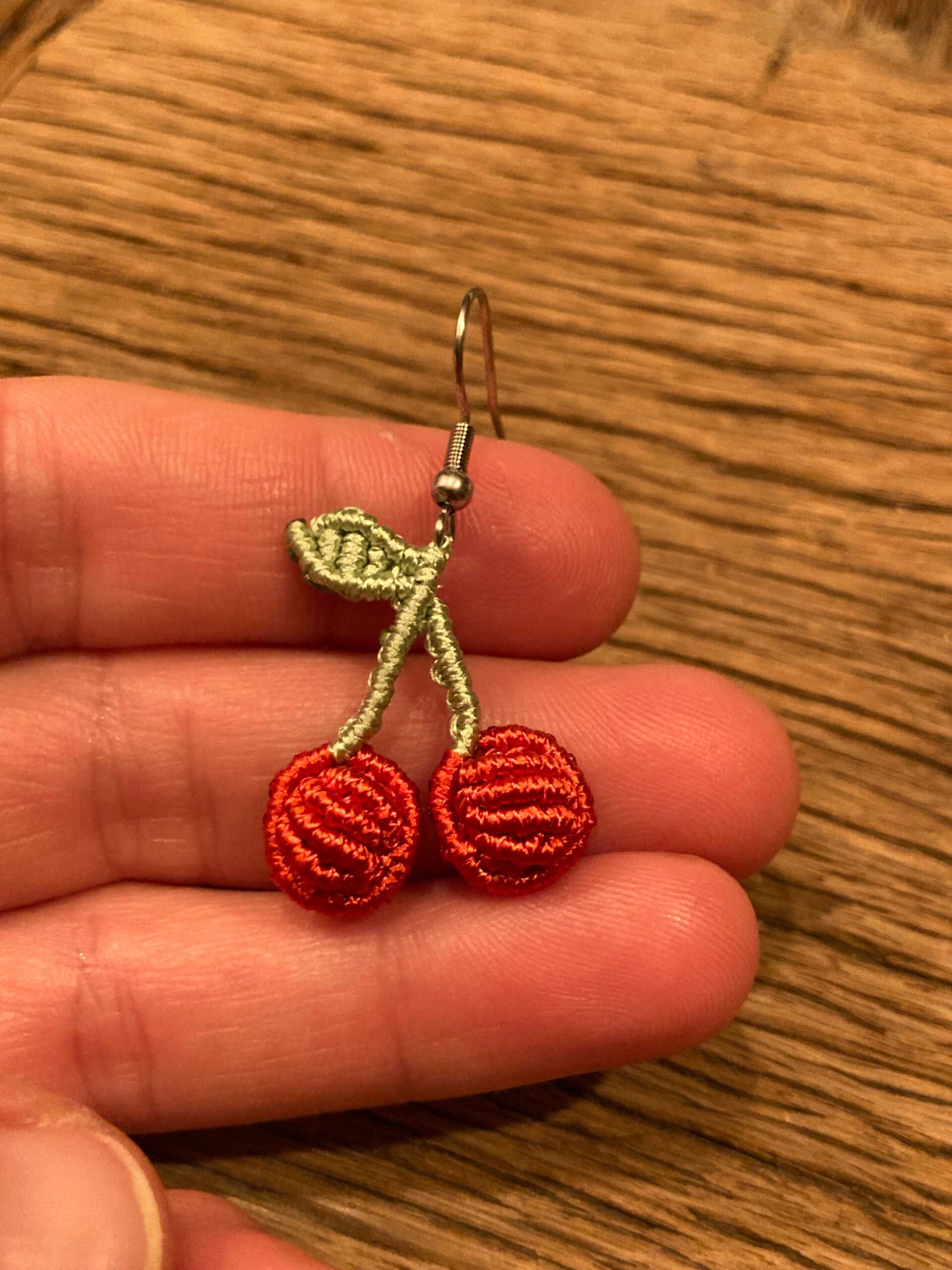Delicate threads weave into ripe, red cherries, kissed by a green leaf—a playful dance of color and charm. These micromacrame earrings dangle like sweet whispers of summer, ripe with warmth, crafted with care.