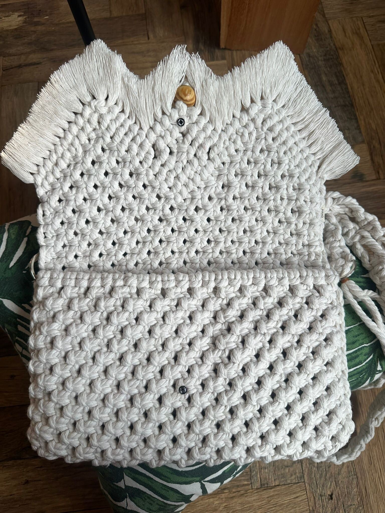 Handmade with care and bohemian flair, the “Palm Breeze” macramé bag is the perfect accessory for sunny days, markets, or festivals. Featuring a soft yet sturdy cotton cord in natural white, this bag blends detailed knotwork with earthy elegance. The diamond centerpiece, braided strap, and flowing fringe make it truly eye-catching. A wooden button and knotted tassels finish the design with a natural, rustic charm.